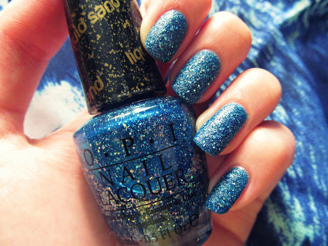 Текстура у лака песочная, в прозрачной голубой базе много синего и серебряного глиттера.